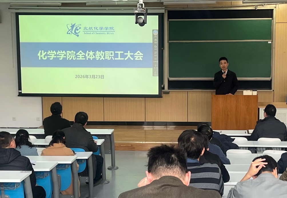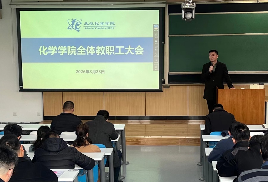 化学学院日前召开全院教职工大会, 学习传达2026年全国两会精神、学校2026年度工作会精神、全面从严治党工作会暨警示教育大会精神,扎实推进树立和践行正确政绩观学习教育。党委书记马千里主持会议。学院全体教职工参加。